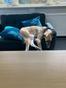 Dash arrived at his new home with Lucy and Steve at 2:30am on Thursday 11th August, and has been settling in perfectly. He clearly loves a cuddle and has claimed his spot on the bed, he’s even been to a CrossFit session and dog agility training already! Dash has even has his induction in the office on 19th, he was such a good boy making sure he was keeping watch over us all and ensuring he kept the sofas warm.